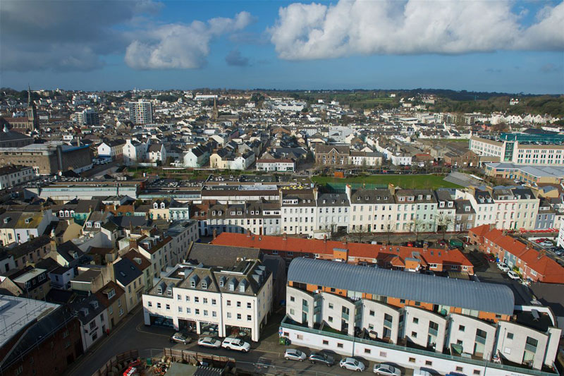 The town viewed from Fort Regent in September 2025. The striking steel and glass dome in the foreground is part of Morier House, the States offices for legal departments. This structure is not visible from street level