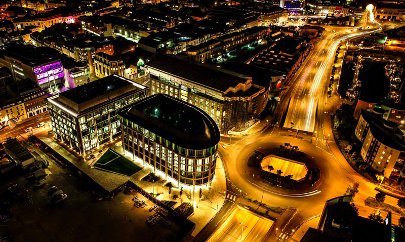 A 2018 drone photograph of St Helier's Waterfront area. The whole of the central area in the picture, including the underpass, is on land reclaimed in the late 20th century