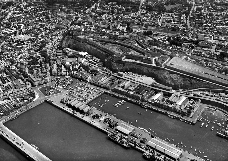 An aerial view of the town, its harbour and Fort Regent in 1960