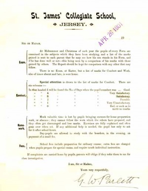 George Parlett was born in 1844, from a Huguenot family in West Walton, Norfolk. He came to Jersey in the early 1860s, initially working as an assistant master at a school in Beaumont Village, before setting up his own school at Coie House in St Saviour’s Road. Renamed Parlett’s Academy, it moved to Janvrin Road, St Helier, in about 1874. The school may have later become Parlett’s Collegiate School, according to an article in the 2008 Annual Bulletin of La Société Jersiaise. But this article, albeit not specifically about George Parlett's schools, but his family, contains a number of inaccuracies.
