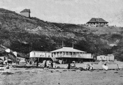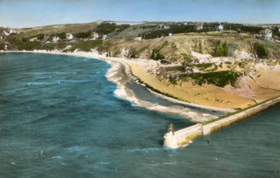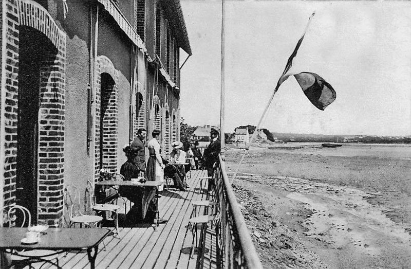 This is the Hotel Angleterre in Carteret. The hotel overhangs the edge of the harbour and this picture was taken before 1922, when it was acquired by Jean Noel Le Saint's family from a company named Le Jersey Francais, which explains why it was flying a Jersey flag. Jean Noel wrote to us to say that Mrs Kathleen Le Sueur, born in St Helier in 1894, used to travel to stay at the hotel, as would many islanders have done. But she was an annual visitor, and became very much a part of the Le Saint family, taking care of Jean Noel and his sister on the beach and bringing them a new toy every year. In 1951, when the family had nowhere to live in Paris, they stayed a year with her in her apartment in Asnieres. The Le Sueurs sold all their properties in Jersey after the Great War to move to Paris, where her mother and father died. She died in Carteret in 1977. Jean Noel would love to know about the circumstances which caused the family to leave Jersey. Please contact us at editorial@jerripedia.org if you can help in any way