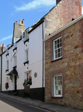Now a guest house. Reputed to date from 1640, but extensively altered in 1800-20 with building extended to the south, and drawing room added with a bow window with views over St Aubin's Bay.