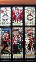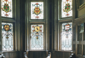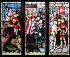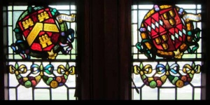 Another of Bosdet's windows, in the corridor of the manor, shows incidents of 15th and 16th century history. On the left is Sir Philip de Carteret making his historic escape from the French during their occupation of Jersey 1462-8. On the right the French commander hands over the keys of Mont Orgueil Castle to Sir Philip de Carteret and the English Admiral, Sir Richard Harliston, who subsequently came to the island's relief.