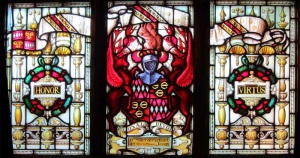 Nothing intimidated, Helier de Carteret promptly drew his own sword and replied pleasantly that if the Governor tried to interfere with the course of justice or as much as moved, he would be a dead man. This lively scene is depicted in the central panel of Bosdet's window.