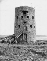 This tower has various names, in addition to its designation 'D' as the fourth of four towers leading up from the southern end of the bay. It was commonly known as the High Tower, because it was taller than the Martello type towers to its north. It was also sometimes known as St Ouen No 3 tower, when it was the third remaining tower in the bay. Another name was L'Ouziere Tower, because of its location in the area known by this name. During the 1930s a garage and two bungalows were built just inland from the tower by Leonard Taylor. These buildings and the tower itself were destroyed by the Germans during the Occupation