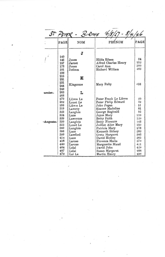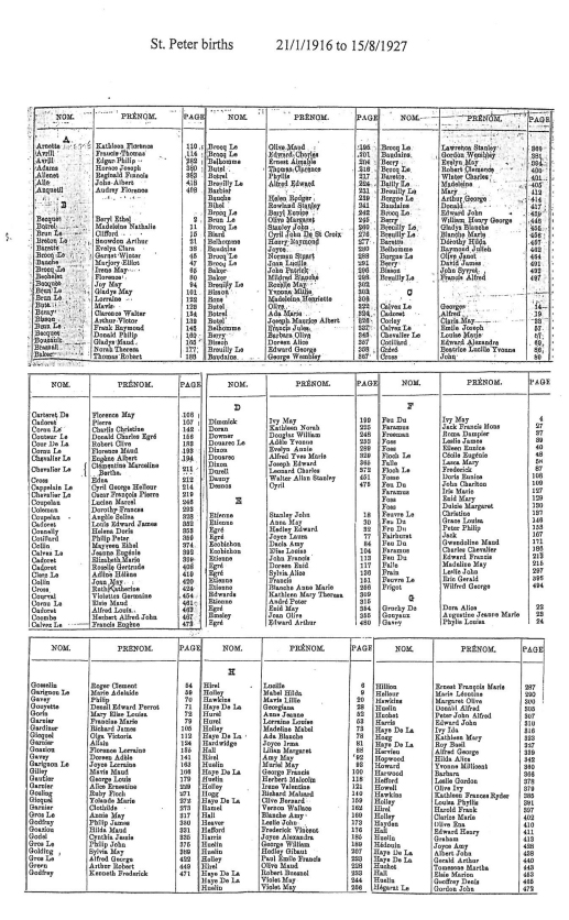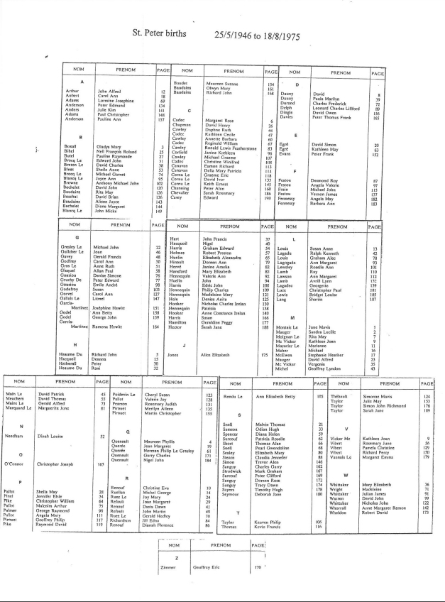 St Peter birth registrations from 1842 to 1915 are included in our database of church and civil records. We have now added this page of images of the indexes to the registrations up to 1975. These records will eventually be digitised and added to our database, but are presented here as images of the pages in the Registrar's index.