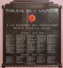 The names of the dead are listed on a wooden and glass panel on a wall in a stair well. The memorial lists the names of 65 men who died during World War I and a further 26 servicemen who perished in World War II. The inscription on the Memorial reads: Paroisse de St Sauveur a La Mémoire Des Paroissiens Morts Pour La Patrie.
