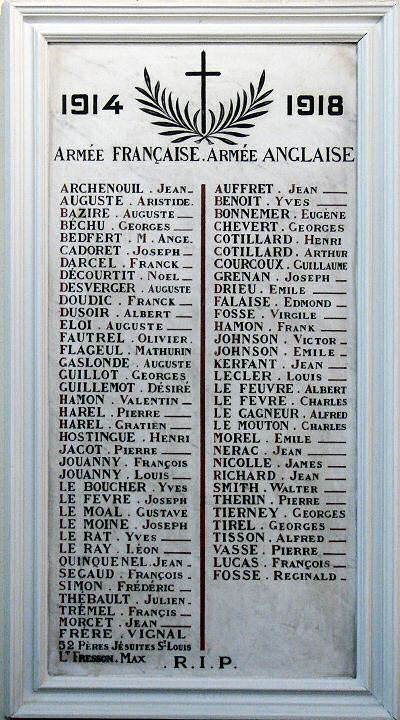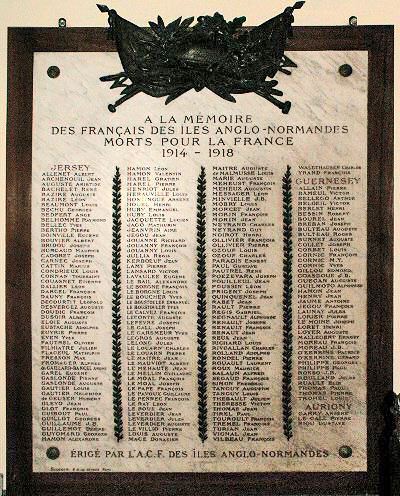 St Thomas' RC Church contains a striking marble memorial to those who fell in the Great War as well as two stone tablets listing the casualties. The memorial was sculpted by Gaucher and unveiled on 18 January 1923 by General de Corn. One of the tablets is a memorial covering French former residents of Jersey, Guernsey and Alderney, which was previously housed in the French Consulate in St Helier, but after its demolition, was transferred to the side chapel of St Thomas'. This is the only memorial to French soldiers from the three islands. The second list is of parishioners of St Thomas' who served in the French and English armies and perished during the war