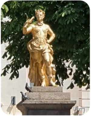 - At the head of the Market Place, upon a pedestal, stands a gilded statue intended to represent George II - the attitude of which is so graceless, and the countenance so unlike, that it has been found necessary to inscribe upon the stone the name of the personage it was meant to exhibit. The fact is - the States of the Island were duped by an old gentleman of the name of Gosset, who wanting a piece of ground to render a house he was building more commodious - offered, for the grant of it, a statue of His Majesty to adorn the publick square. The proposal was accepted and the figure was brought over from England. The site had been previously prepared, and iron rails placed round, to keep off the rude hands of curiosity. A day was fixed for displaying to the Inhabitants the brazen image of their Monarch - it was conveyed to its eminent station under the inscrutable cover of a blanket - the publick eye became eager to behold the Royal Effigy - the signal was given and the veil withdrawn - when instead of the British King - Jersey had conspicuously placed in its capital - the statue of a Roman Emperor.