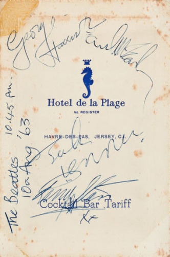 How much for a set of autographs of the fab four on the way back from Jersey? The shipping cost from Chorley, Lancashire, to anywhere in the world was 46 US dollars. That presumably included a fair sum for insurance, because the autographs themselves were on sale for 7,967.55 dollars. Not bad when you read above what the Beatles were paid by the Jersey promoter of the concerts