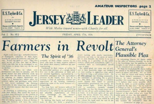The Jersey Leader was a short-lived weekly newspaper in the 1930s with the motto: ‘With Malice toward none – with Charity for all’.