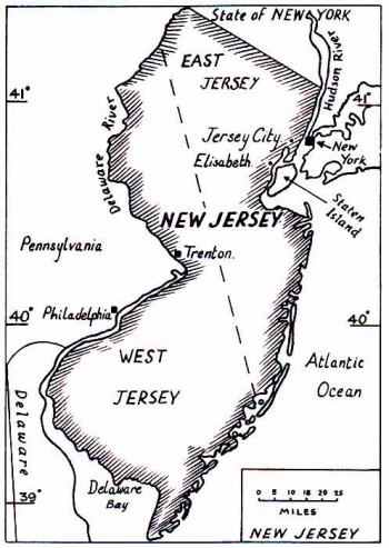 The main interest of this brief period in the history of New Jersey lies in the exciting events connected with the government of the territory, some of which were attributable to the complex and confused relationships that then obtained among the royal entourage in England. By a grant from the Duke of York, in 1664 Sir George Carteret and his fellow courtier and royal favourite Lord John Berkeley, became joint Lords Proprietors of about 8,200 square miles of territory lying between the Hudson and Delaware rivers, the boundaries of which are still those of New Jersey today.
