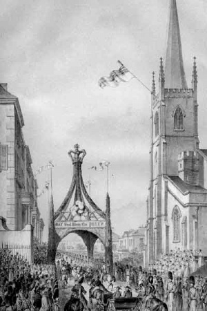 The view of the Royal Square has more fascinating detail. The Royal Court is the second building on the left; the statue of George II is central; and the town church can just be seen behind the railings. From here the Royal party turned through Peirson Place into King Street, and then north into Halkett Place. The market had been handsomely decorated, and there were arches at almost every corner.