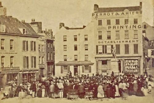 A remarkable variety of retail businesses operated in the Square over the decades. In 1837 baker T Webb; boot and shoe maker J Baptist; a hatter named Cotton; ironmongers de la Taste and Macguire; drapers de La Taste and Wright; and silversmith E Kerby were all included in the commercial directory, along with the circulating libraries run by E Bond and Philip Payn, and the music sales and circulating library of W Davies.