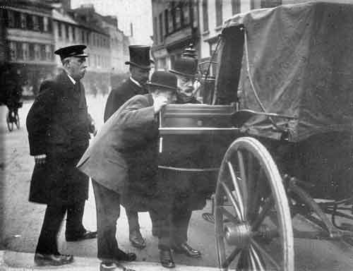 An early car demonstrates its power by climbing the steps from Snowhill to Regent Road ...