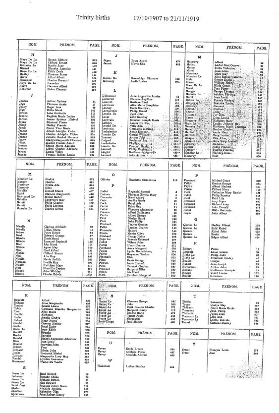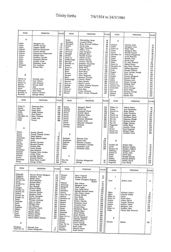 Trinity birth registrations from 1842 to 1915 are included in our database of church and civil records. We have now added this page of images of the indexes to the registrations up to 1984. These records will eventually be digitised and added to our database, but are presented here as images of the pages in the Registrar's index.