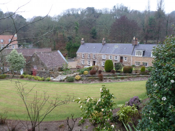 A mill leat runs alongside the southern outbuilding, which has an overshot wheel.