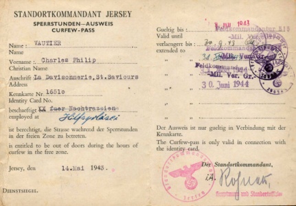 Curfew pass issued to Charles Vautier during the Occupation as a member of the St Saviour Honorary Police [1]