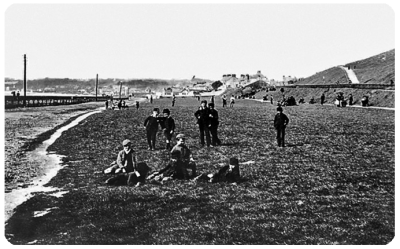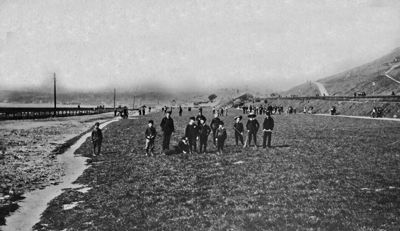 The Lower Park in 1893, before Victoria Avenue was built. The railway line can be seen running along the coast in the left of the photograph. In common with many open areas at the time, the slopes of Westmount on the right of the picture were devoid of any trees. Planting trees in open public areas was very much a 20th century practice in Jersey