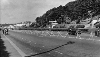 Spectators and cars leaving the circuit on Victoria Avenue at the end of the 1948 road race