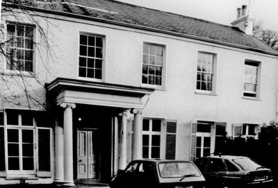 Roughcast render walls. 12 pane (6/6) sash windows to first floor, French windows to ground floor. Entrance in fifth bay. Rectangular doorcase with geometrical glazing pattern in horizontal fanlights and sidelights; within large porch with Ionic columns and simple entablatures. Altered and converted former coach house outbuilding to rear.