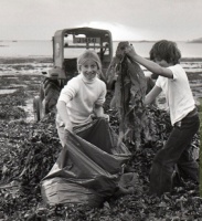 - "Though regular vraicking is permitted only at stated times, yet, as in tempestuous weather large quantities are torn from the rocks, and drifted onshore, the farmers are at all times on the watch so that, even in the midst of winter, whole families, comprising men, women, and children, of both sexes, are seen raking together the highly prized boon of Neptune, and sometimes breast high in the water; vraicking, like a Catholic holiday, suspending all other secular employments.