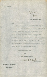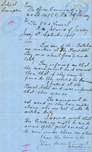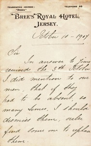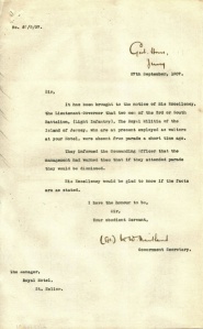 The story of two unnamed waiters at Bree's Royal Hotel starts with a letter on 4 September 1907 from the officer commanding the South Battalion of the Royal Militia Island of Jersey to the Lieut-Governor, Major-General Sir Hugh Sutely Gough, advising him that the men had been absent from compulsory Militia duty recently, claiming that they had been threatened with the sack if they took time off for these duties.