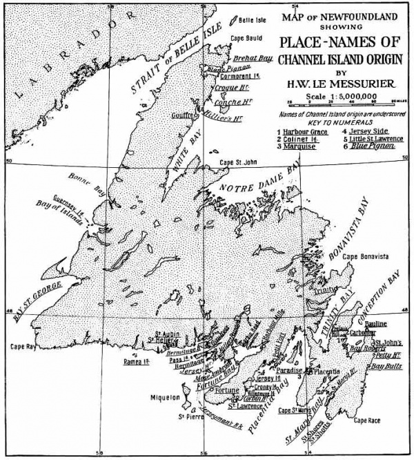 It may be said that these names were universally used by French, Spanish, and Portuguese discoverers in naming the new places that they found, but I am strongly of opinion that surrounding circumstances and early occupation by Channel Islanders prove that the names originated with them. On the northeast coast of Newfoundland the majority of places have French names. It is difficult to say whether the French are responsible for any of them, but many are undoubtedly Channel Island names. Brehat Bay, on the eastern shore of the long, narrow peninsula in the north, is one, and no doubt reminded a Channel Island fisherman of the place where he moored his fishing vessel during the months of winter.