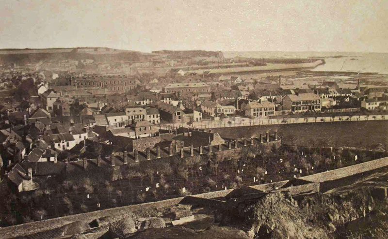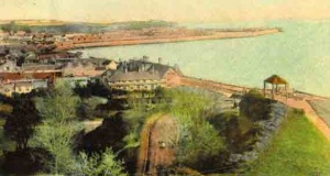 View across West Park area to St Helier Harbour and Fort Regent from Westmount in the 1880s. The Marine Hotel and Baths in the middle, later the site of the Grand Hotel, with derelict site covered in rubble and timber alongside, part of West Park station in construction, and the bare site of Traingle Park