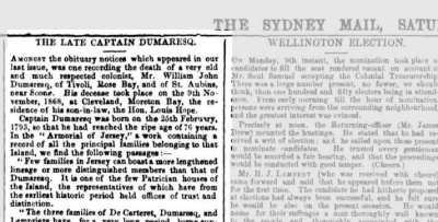 - "Among the obituary notices which appeared in our last issue, was one recording the death of a very old and much respected colonist, William John Dumaresq, of Tivoli, Rose Bay, and of St Aubins, near Scone. His decease took place on 9 November 1868, at Cleveland, Moreton Bay, the residence of his son-in-law, the Hon Louis Hope.